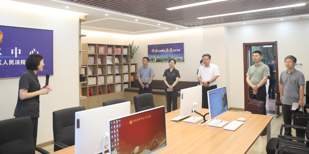 在市中区人民法院党组书记、院长毕惠岩等领导的陪同下,徐庆国书记一行实地参观了该院“小柿暖心办”诉讼服务中心、诉源治理中心、融媒体工作室以及音视频调解室、互联网法庭等办公办案场所。参观中,立案庭庭长韩晓爽、审判管理办公室(研究室)副主任李冬华向徐庆国书记一行详细介绍了法院成立以来的审判业务开展情况。