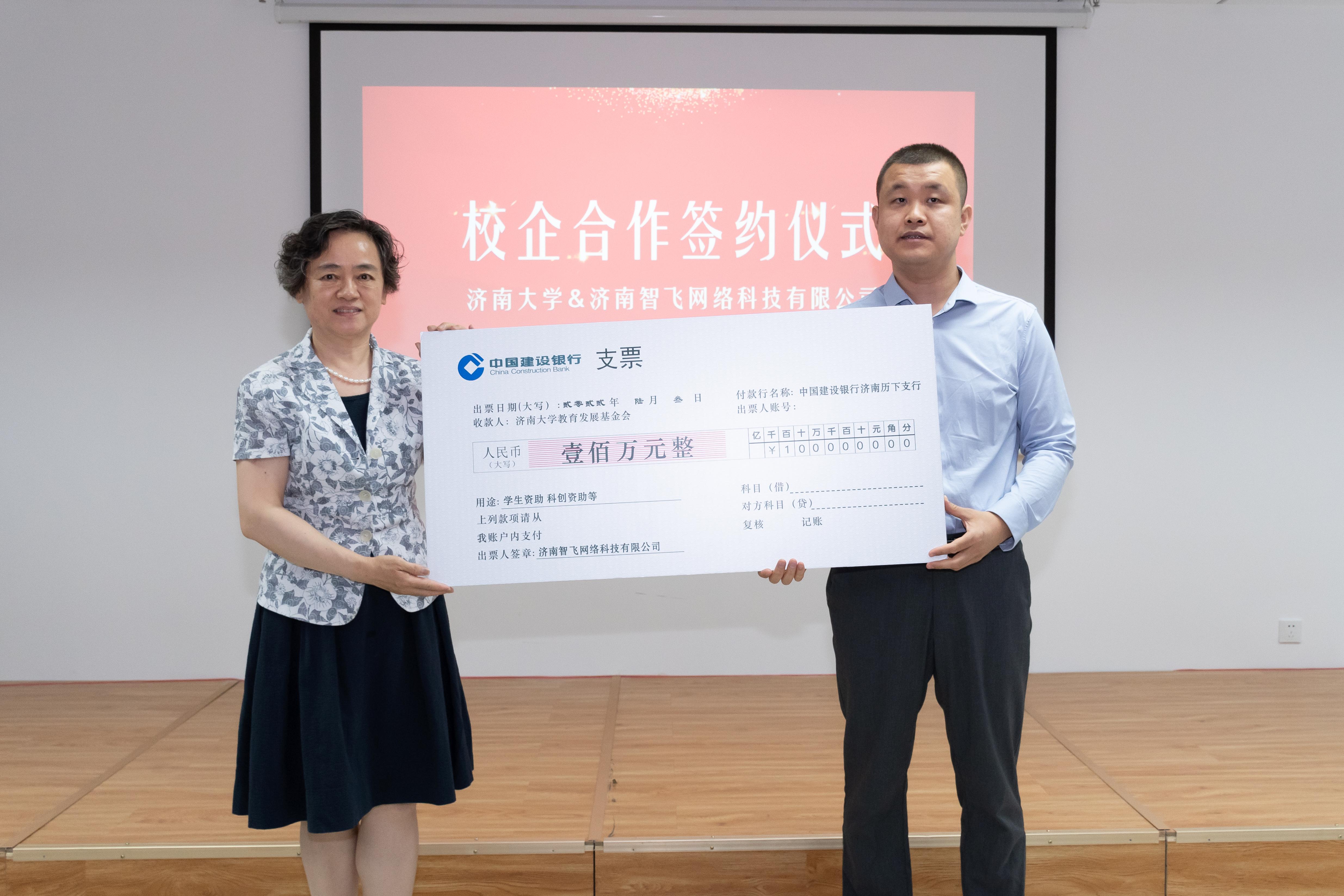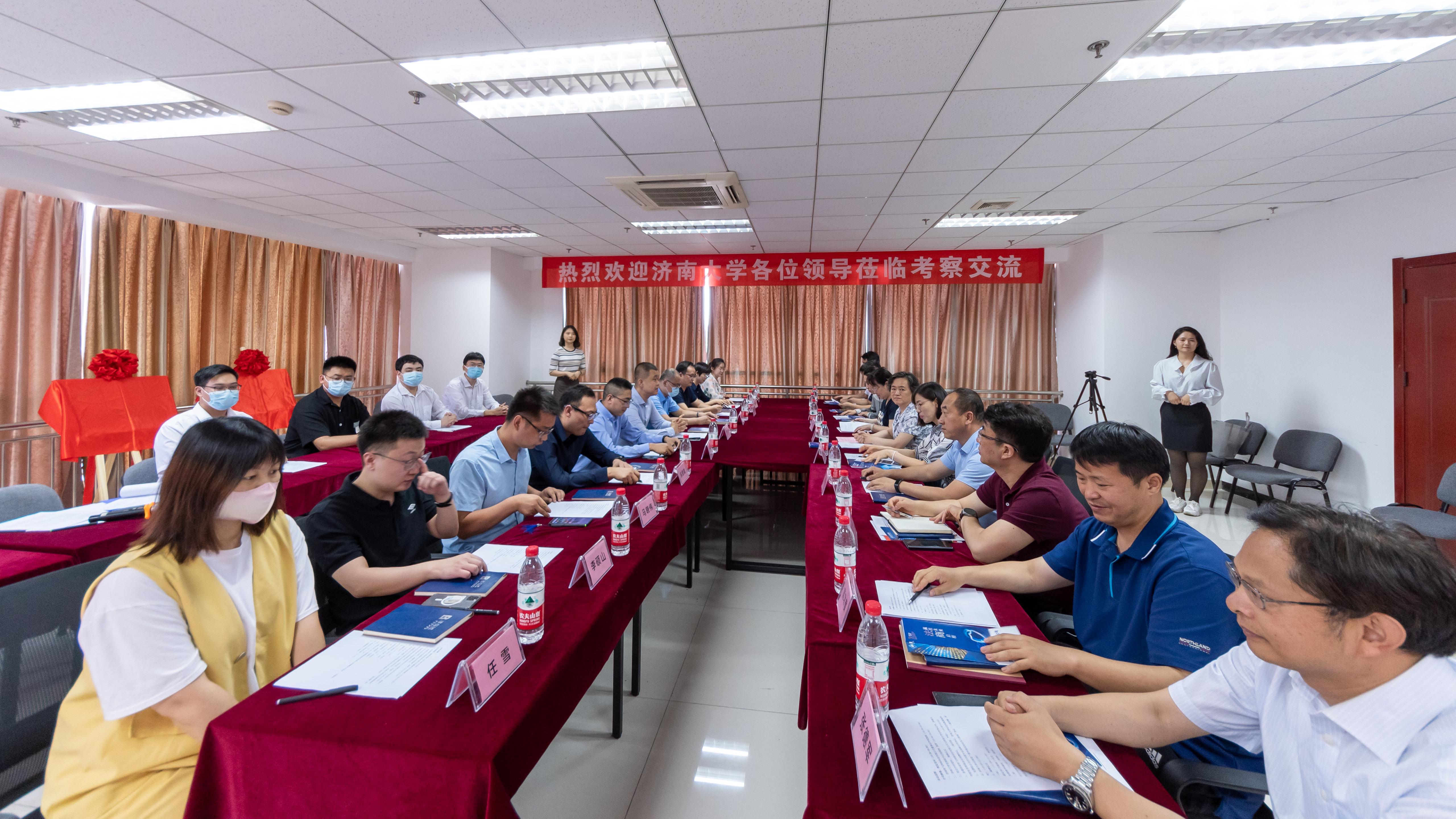 一行到访表示欢迎,介绍了智飞公司的发展历程与创办理念,公司致力于与多个律师平台建立长期合作关系,为企业客户提供优质法律顾问服务。尹滨校友在校期间曾获国家奖学金、助学金等,在事业有所成就之时,积极回馈母校的教育和培养,助力母校的发展。张硕秋副书记代表学校向智飞公司及尹滨校友对学校人才培养的关心关注表达了感谢,特别感谢尹滨董事长及智飞公司助力高校教育事业发展的捐赠善举。张书记讲到学校的发展离不开社会各界心系母校发展的优秀校友,尤其是校友精神,校友身上的济大烙印,校友对母校的牵挂,是促使学校高等教育事业发展的源泉和动力。她还介绍了学校的历史沿革,特别是近年来学校在人才培养、学科建设、教学改革、山东省“冲一流”高校建设等方面取得的成绩和做法。并殷切希望校企双方进一步拓展合作领域,进行全方位、深层次、多学科的交流与合作。
