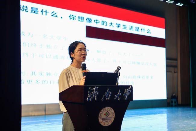 2023级辅导员迪妮尕尔·艾尔夏提老师以“同呼吸 共命运 心连心”为主题详细介绍了新疆籍少数民族学生教育管理服务工作,具体从新疆地区地域特点与风俗习惯、我校新疆籍少数民族学生与民族工作队伍情况、“石榴籽”工作室等方面展开讲解。此外,迪妮尕尔·艾尔夏提老师向新生提供了2023届本科毕业生升学、就业数据,勉励新生立足当下,及早确立发展目标。