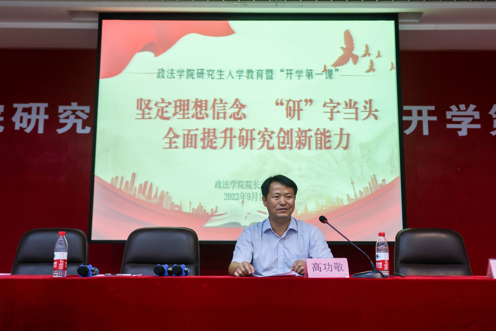 开学典礼结束后,院长高功敬以《坚定理想信念,“研”字当头--全面提升研究创新能力》为题开讲开学第一课。他强调,创新能力的培养是研究生教育的核心任务,要在养成科学精神的同时,更要掌握科学研究方法,具备良好的创新思维。在研究生学习期间,不仅要努力学习专业知识,提高科研能力,更要具备问题意识,培养自己的文献搜集和处理能力,不断提高科研表达能力,努力创新,争做担当民族复兴大任的时代新人。