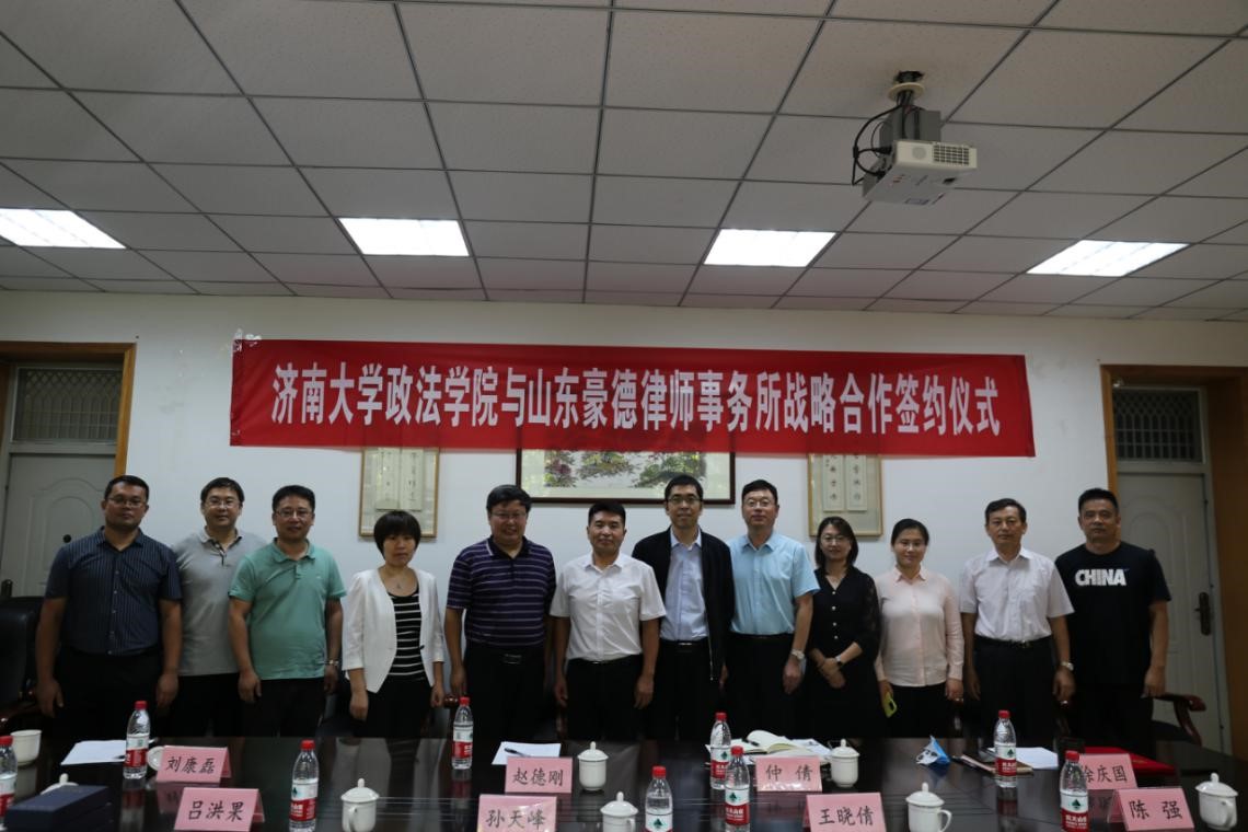 举行。学院党委书记徐庆国、学校教务处副处长赵德刚、学校研究生院副院长仲倩、学院副院长刘康磊、学院教师代表与山东豪德律师事务所副主任孙天锋、副主任吕洪果、诉讼中心主任王晓倩、常法中心执行负责人吴绍祥出席签约仪式。