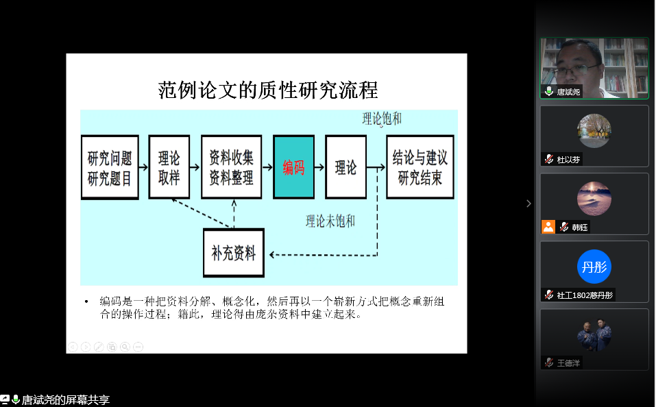 唐老师首先就一篇规范的学术论文应该包含什么结构对同学们进行了讲解,以“嵌入中的专业社会工作与街区权力关系”论文为范例,分析了论文的质性研究流程,指出这一流程包括确定研究问题、进行理论抽样、收集和整理资料、编码、选取契合的理论作为分析视角,最后提出研究结论与建议的过程。最后唐老师强调了学术敏感性的重要性,和同学们分享了如何在日常生活中确定研究问题,从而将社会现象转化为可研究的学术问题的思路。