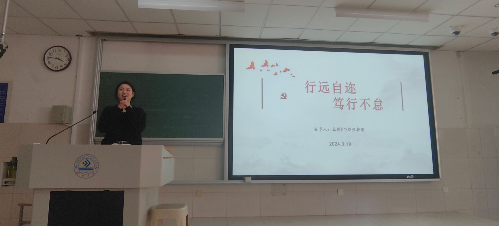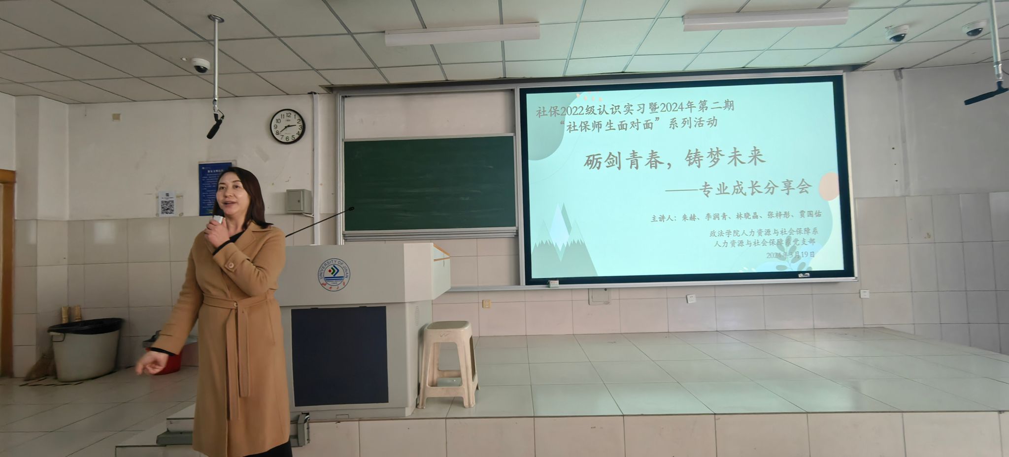 社保2022级认识实习暨2024年第二期“社保师生面对面”系列活动之“砺剑青春,筑梦未来”专业成长分享会于3月19日在2教105成功举办。本次专业成长分享会由人力资源与社会保障系和系党支部精心策划,邀请五位优秀学子担任主讲嘉宾,系党支部书记辛瑞萍老师担任主持人,朱丽敏老师、杨风老师、刘艳丽老师,社保2022级全体同学、公管2023级部分同学参加了分享会。