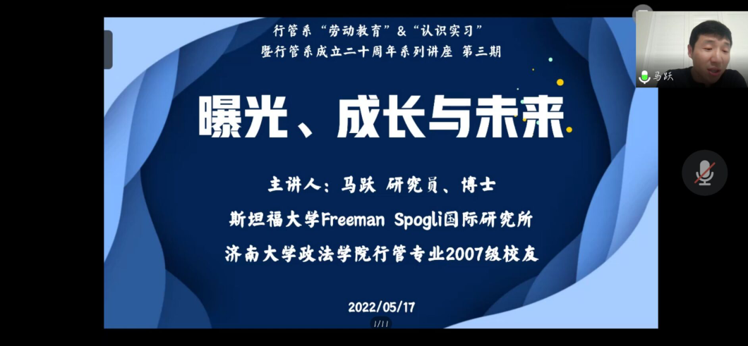 行政管理专业“劳动教育”&“认识实习”暨行管系成立二十周年系列讲座第三期线上成功举行。本次会议邀请了斯坦福大学Freeman Spogli国际研究所经济学研究员、我校行政管理专业2007级优秀校友马跃博士进行主旨分享。麻豆成人
