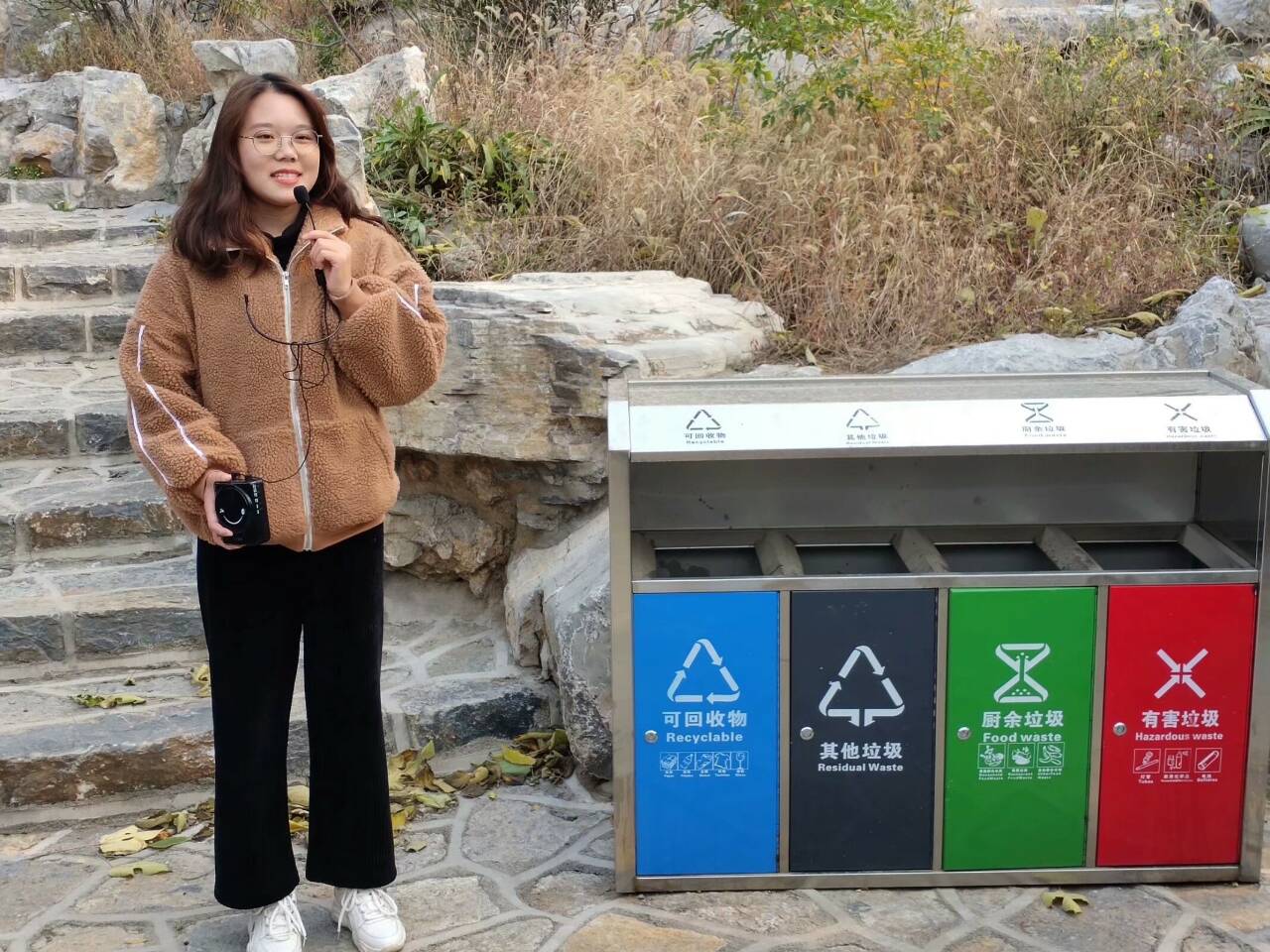 一路上秋风微凉,但志愿者们热情不减。到达第一处休息地点后,李红波向大家讲解了垃圾分类的相关知识,以呼吁同学们在日常生活中将垃圾分类,让资源再生。短暂休整过后,志愿者们继续前进。树影幢幢,山高路陡,在保证自身安全的前提下,志愿者们也在积极捡拾沿途的垃圾,保护青山绿水。不久,志愿者们便到达了第二处休息地点,张云涛开始向大家讲解消防知识,让志愿者们认识到了消防安全的重要性。随后,志愿者们继续向上攀登,终于抵达半山腰处的凉亭。孙晓蕾为大家讲述了中国传统建筑——“亭”的有关知识,丰富了大家的传统知识储备。在这里,志愿者们一起玩了许多小游戏,活跃了活动氛围,拉近了同学们之间的距离。旅程还未结束,志愿之旅还在继续。登高望远,秋意更浓,山顶的风景令大家耳目一新。志愿者们纷纷拍照留念,记录下这个美好瞬间。欣赏完风景并捡拾完山顶的垃圾后,志愿者们开始有序下山。返回的过程中,同学们仍不忘留意是否还有垃圾遗留。途中,田茂泉还为大家讲解了气候与植被的有关知识,加深了大家对大自然的了解。 下午4:00,全体成员安全返回山脚。志愿者们做最终清点时发现捡到的垃圾并不算多,这一点让大家非常高兴,欣慰于环保理念深入人心,本次活动也画上了圆满句点。