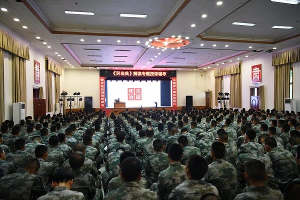 此次授课,刘康磊副院长围绕“以国家治理体系和治理能力现代化为视角”这一鲜明主题,详细的介绍了法的由来、法的框架,并结合官兵实际情况,对《民法典》编撰的过程、背景、亮点、创新等多个方面,采取以案说法、以身说教的方式,用通俗易懂的兵言兵语进行阐述,既有理论深度,又有很强的实际指导意义。