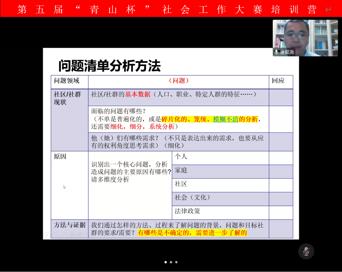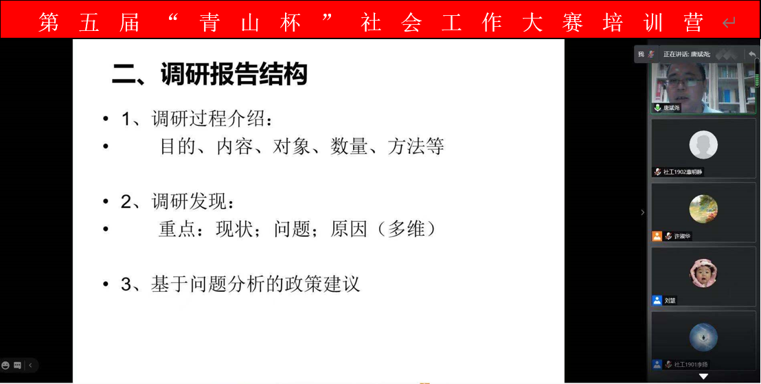 第五届“青山杯”社会工作大赛活动自2021年4月中旬面向全校正式启动以后,正有序开展,不同专业的同学们踊跃组队报名参赛。为帮助相关团队完成好社会服务项目策划书和调研报告,提高参赛作品质量,社会学系党支部于2021年5月19日19:00—21:00连续举办了两场辅导培训会。会议采用腾讯视频会议的线上形式,由许淑华老师主持和总结,社会学系党支部书记唐斌尧老师主讲,四十余名参赛队伍代表参加。