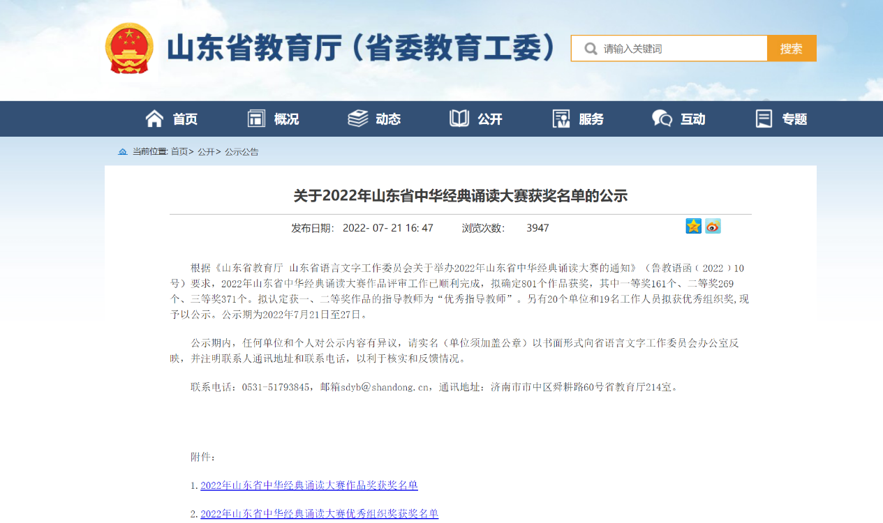 7月21日,根据山东省语言文字工作委员会办公室在山东省教育厅(省委教育工委)官方网站上发布的2022年山东省中华经典诵读大赛获奖公示名单,麻豆成人