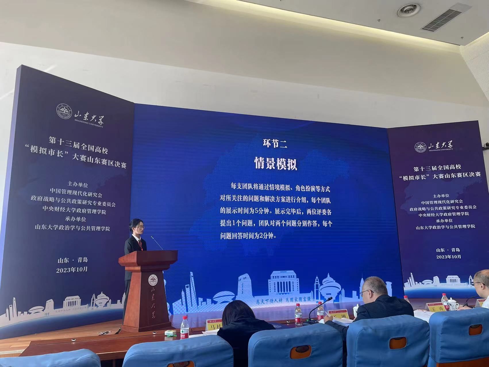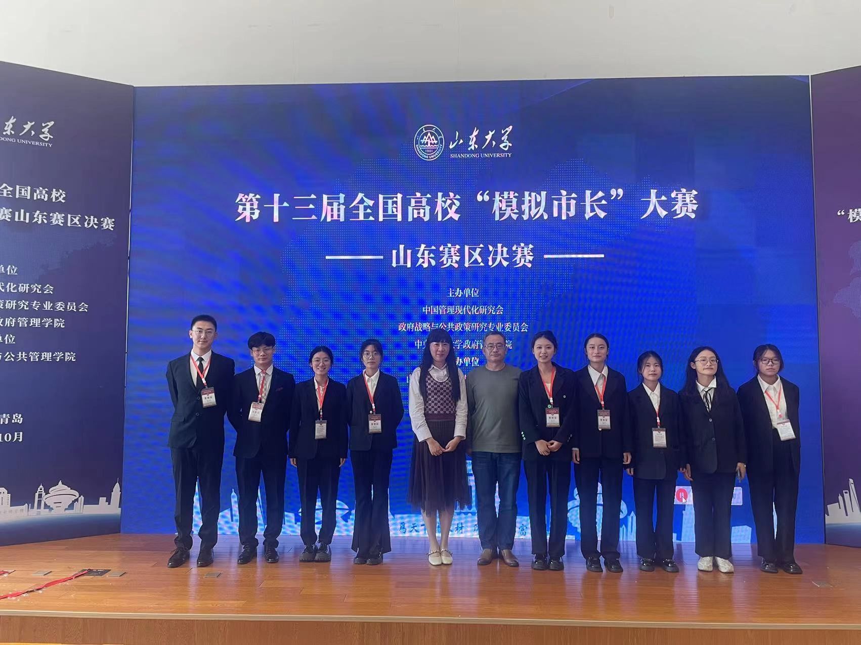 10月28日,第十三届全国高校“模拟市长”大赛山东赛区决赛在山东大学(青岛校区)圆满收官。大赛由中国管理现代化研究会政府战略与公共政策研究专业委员会和中央财经大学政府管理学院主办,山东大学政治学与公共管理学院承办。人力资源与社会保障系主任杨风老师、行政管理系曹玉梅老师带队参赛。由人力资源与社会保障系孙红晔老师、刘雪老师指导,社保专业22级吴永琪、何昕怡、仇悦、陈婷婷、陈玉洁组成的“泉心泉意”队,由行政管理系曹玉梅老师、人力资源与社会保障系刘雪老师指导,行管专业22级张文彪、李琦、张贤飞,社工专业22级国英慧组成的“饮水思源”队双双获得三等奖。