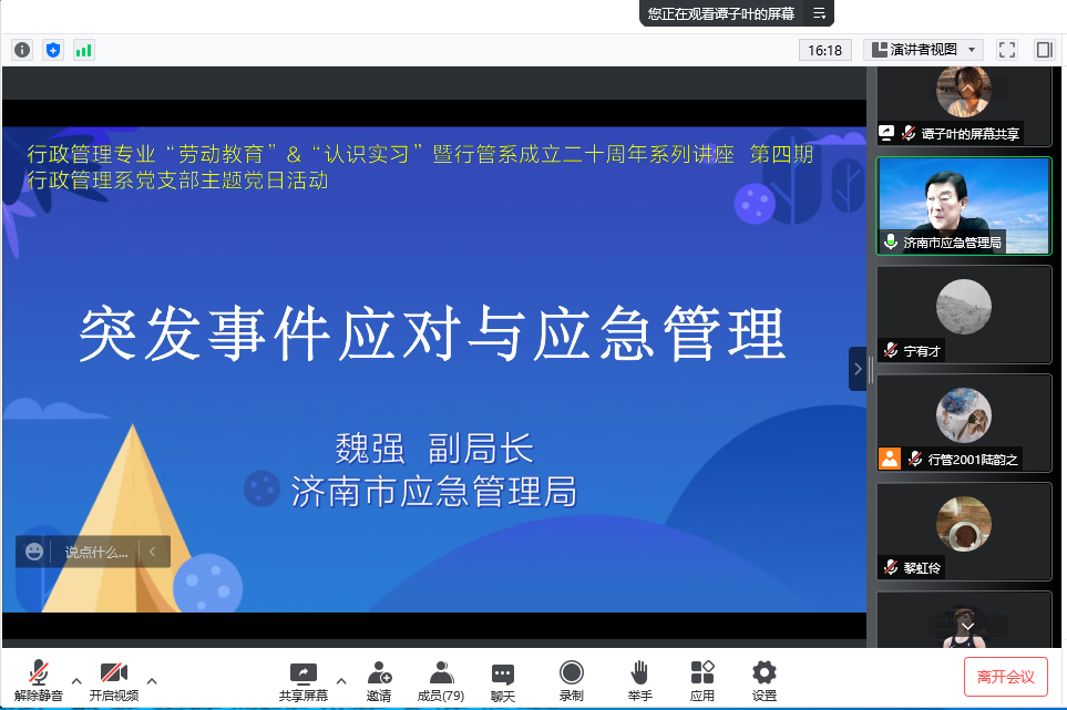 行政管理专业“劳动教育”和“认识实习”暨系成立二十周年系列讲座第四期线上成功举行。本次邀请了济南市应急管理局魏强副局长做《突发事件应对与应急管理》的主题报告。麻豆成人