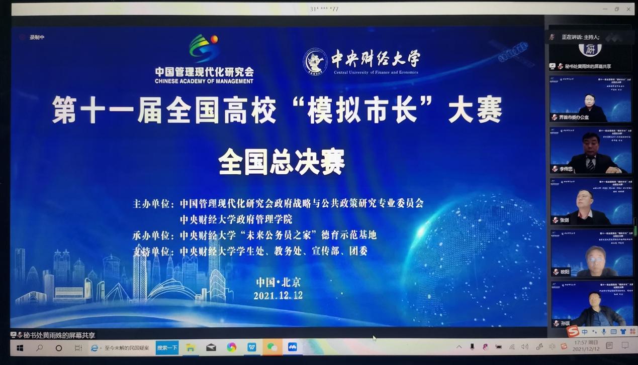 2021年12月12日,由中国管理现代化研究会政府战略与公共政策研究专业委员会和中央财经大学政府管理学院主办,中央财经大学“未来公务员之家”德育示范基地承办的第十一届全国高校“模拟市长”大赛全国总决赛圆满落幕。第十一届全国高校“模拟市长”大赛于2021年7月正式启动,先后举办了京津冀赛区赛、粤港澳大湾区赛区赛、山东大学校内赛、麻豆成人