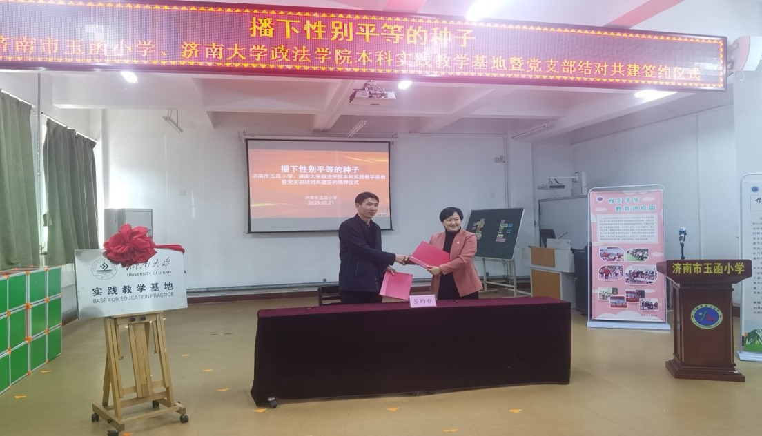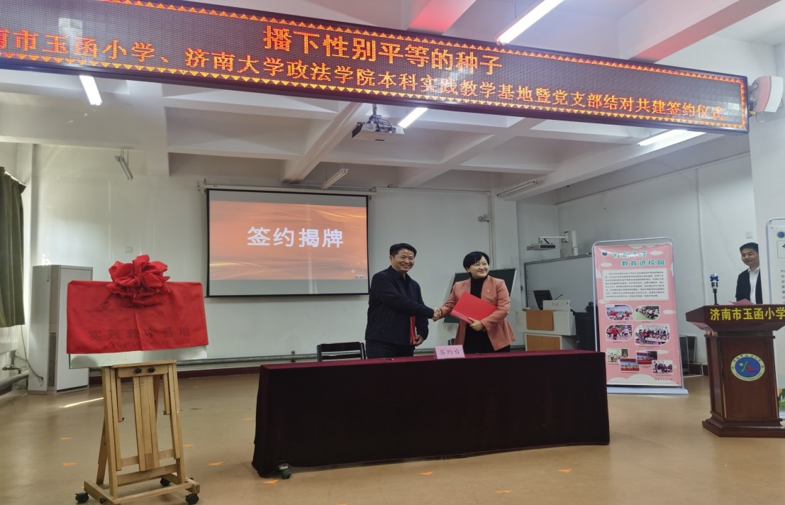 本科实践教学基地建设协议、就业实习基地建设协议、社会学系党支部与济南市玉函小学党支部结对共建协议,并为基地单位授牌。