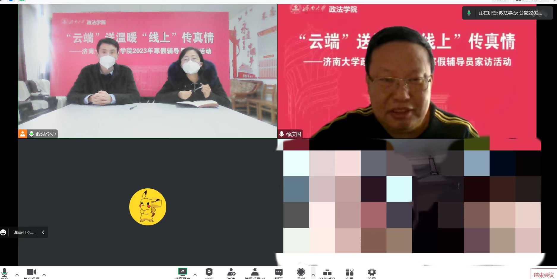 访本科新生,寄青春希望。学院党委书记书记徐庆国与2022及辅导员刘晓娟老师线上家访了本科新生小孟和小许。交流中,徐书记向两位同学及其家长介绍了学校的校园环境、办学条件、学科专业以及在教学研究方面取得的成绩,并结合学生的专业和疑问,就人才培养,学业规划等方面与其进行了针对性的交流与指导。云端家访可以更加清晰、更有针对性地了解了大一新生的学习生活状况,为今后的学生工作与家长的支持配合打下了扎实的工作基础。
