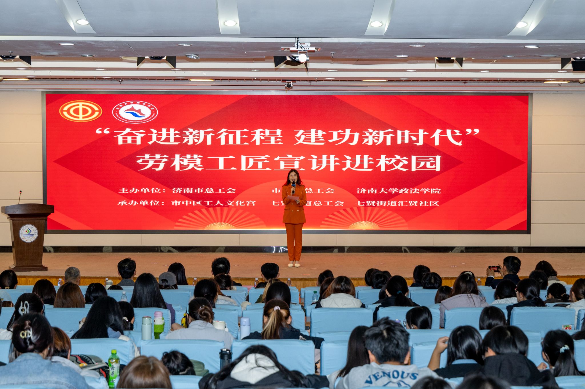 联合济南市市中区总工会、七贤街道总工会邀请济南市总工会“筑梦泉城”劳模工匠事迹宣讲团来我校开展“奋进新征程 建功新时代”劳模工匠宣讲活动。党委常委、副校长李强,济南市总工会宣教部二级调研员张昭力,党委学生工作部(处)部(处)长卢旺,麻豆成人
