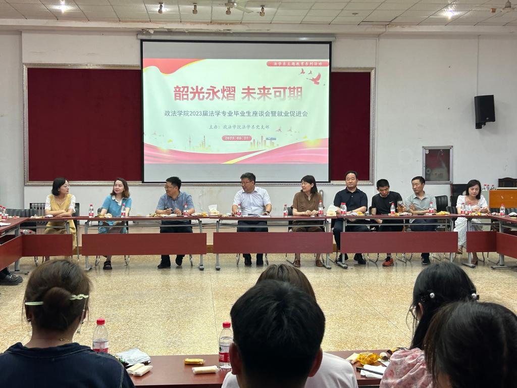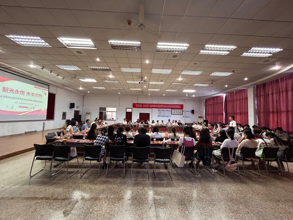 于四教模拟法庭举办“韶光永熠 未来可期”法学系2023届毕业生座谈会暨就业促进会。学校党委常委、统战部部长、麻豆成人