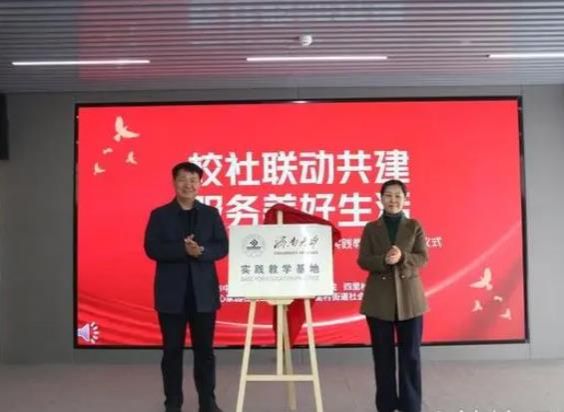 实践教学基地揭牌。紧接着,张燕局长发表讲话,指出社会工作在基本民生保障、基层社区治理、基本社会服务等方面的专业优势和积极作用,对维护社区稳定、促进社区发展有着重要贡献,希望以此次校社联动为契机,探索社工人才培养新模式、新思路和新方向,共促社工事业发展。会议最后合影留念。