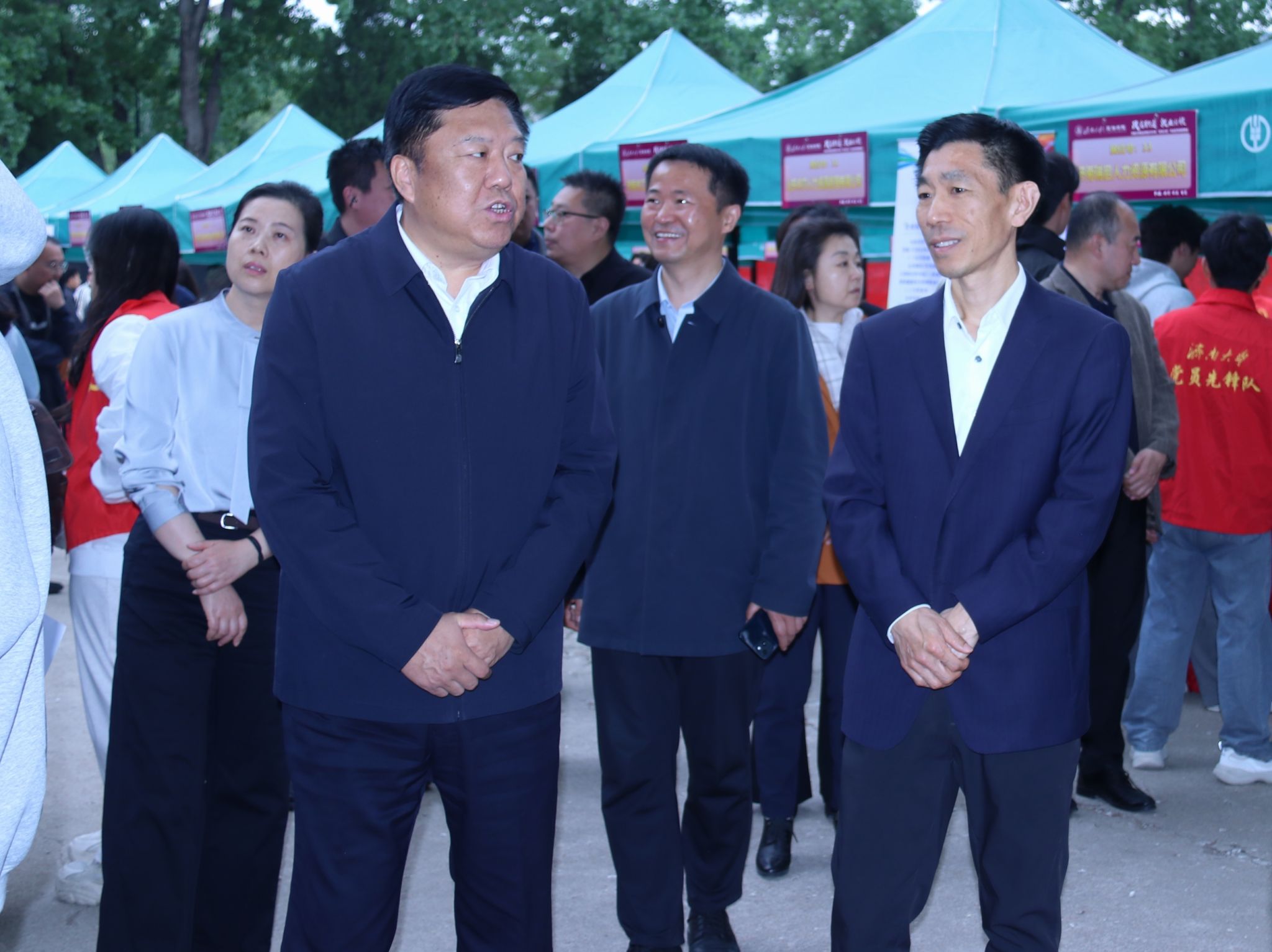 活动当天,与会领导逐一走访企业展位,与招聘单位负责人深入交流,详细了解行业发展趋势、岗位设置特点及人才需求方向。学校领导亲切慰问现场求职毕业生,细致询问大家的求职意向、职业规划与实际困难,鼓励同学们锚定基层治理、法治建设等国家战略需求,发挥政法专业特长,以实干担当投身时代建设,在服务国家和社会发展中实现人生价值。