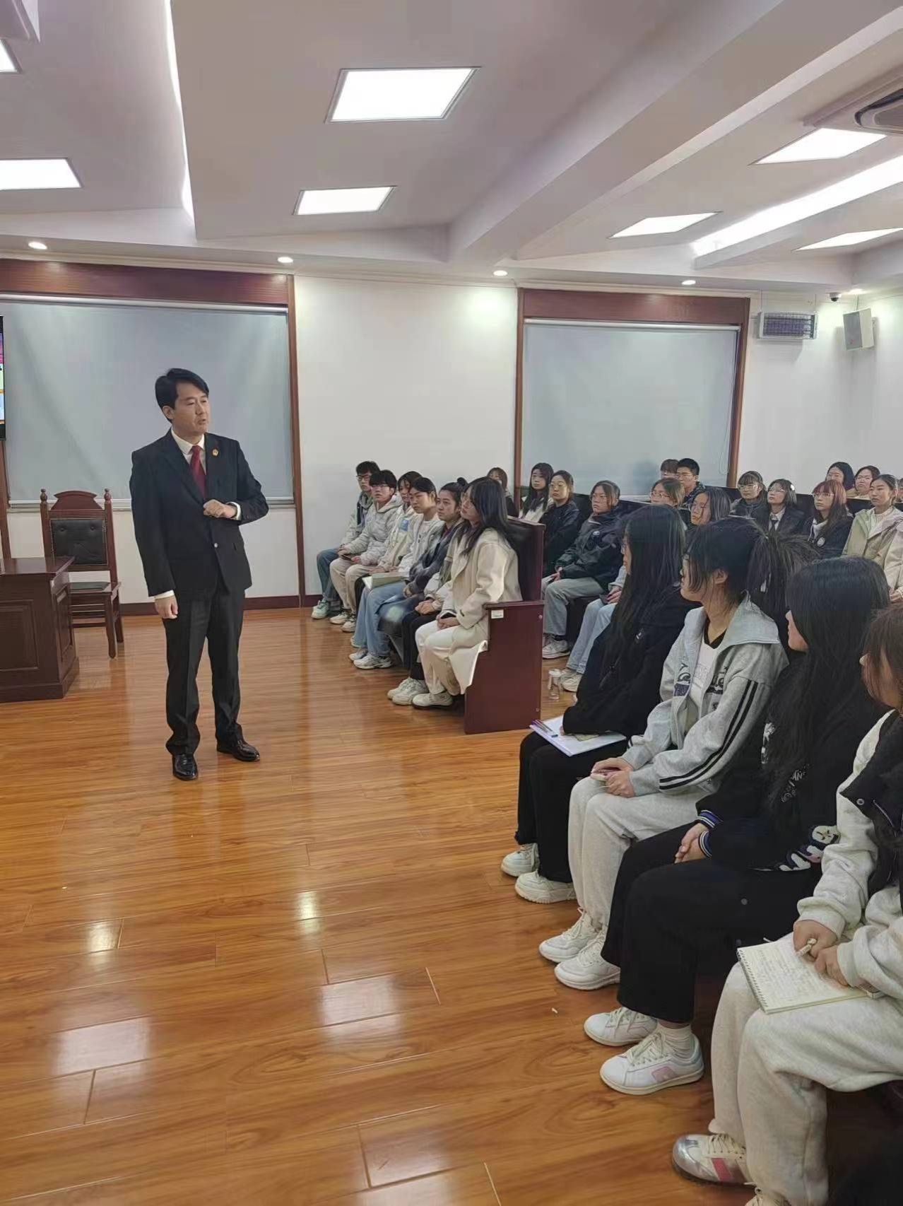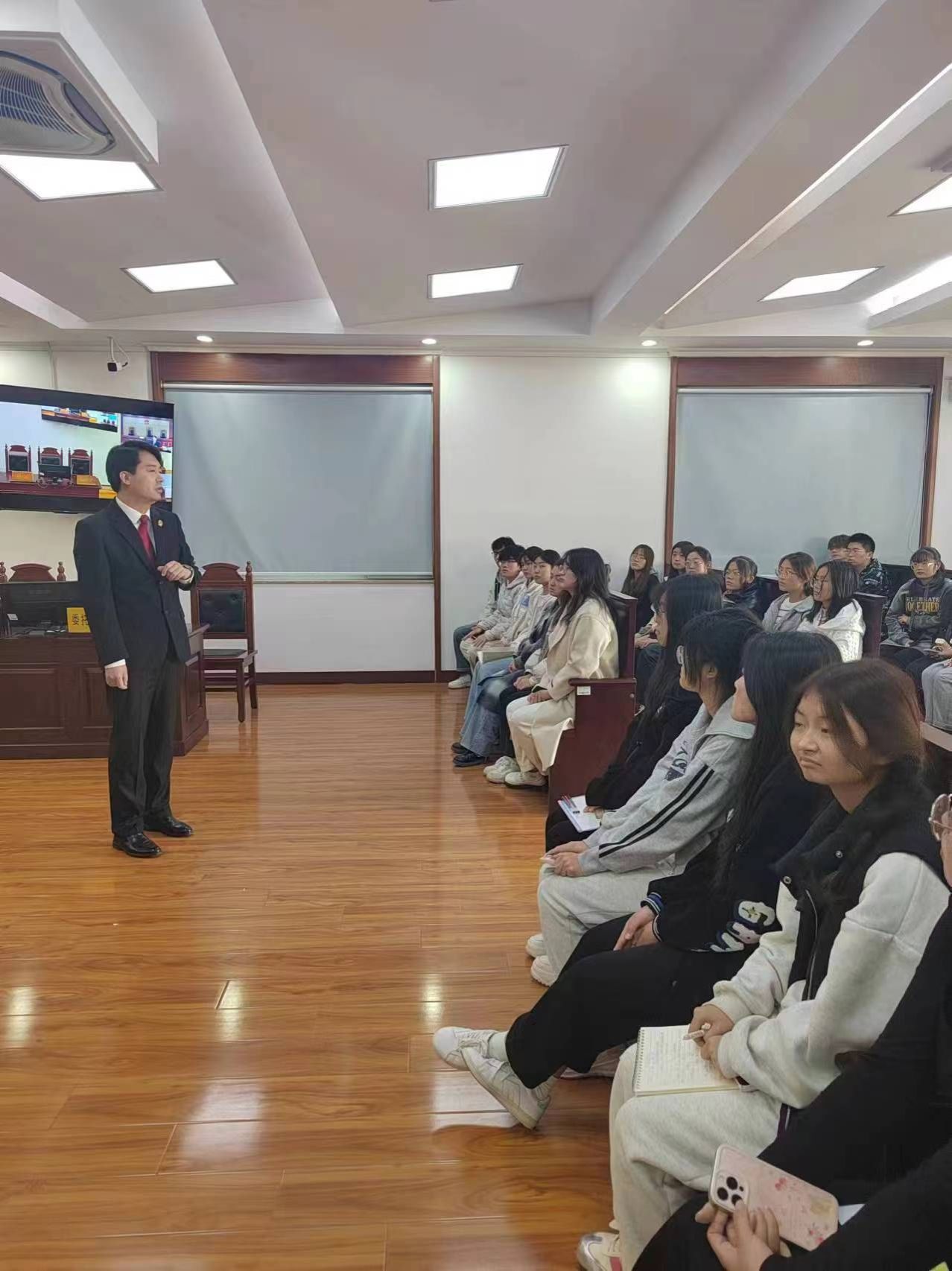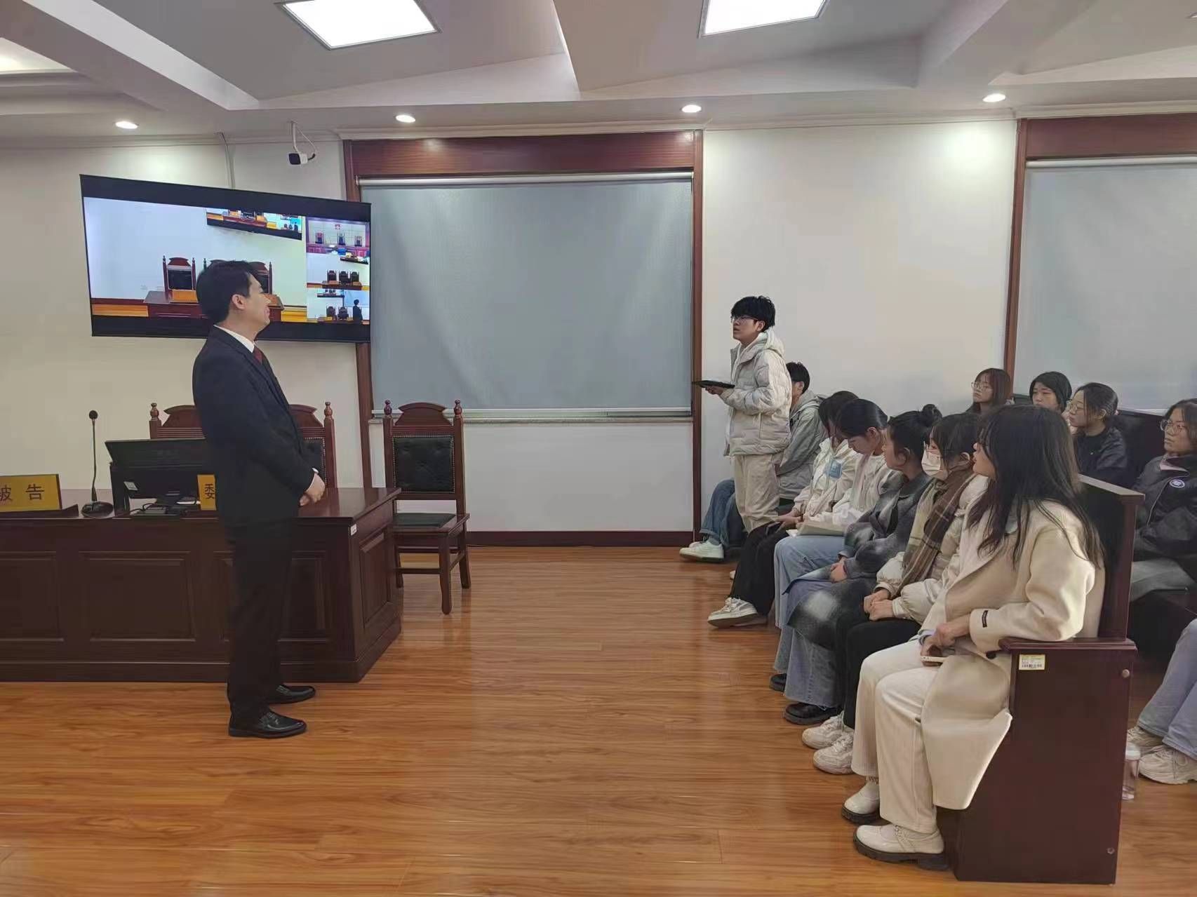 法学2022级、2023级本科生共同参加了市中区人民法院七贤法庭举行的法庭旁听活动,让同学们深刻感受到了法律的神圣不可侵犯。学生们对此次旁听活动充满期待,做了充分的准备。在开庭的前三十分钟,卢娜法官带领同学们在法庭门口与法院工作人员合影留念,随后学生们就整齐有序地排队进入审判庭安静等待开庭。首先,赵同庆法官为我们讲述了案件的概要,此次庭审是有关生命权、健康权的案件,基本案由是原告的父亲在被告的疗养院因异物堵塞食道导致窒息死亡,且疗养院采取的急救措施不正确,导致原告的父亲错过最佳抢救时机。在庭审过程中,学生们服从法庭指挥,遵守法庭礼仪,不仅全神贯注地听审判的全过程,还奋笔疾书地记笔记。庭审结束后,赵同庆法官组织同学们在审判厅召开座谈会,几位同学积极的问问题,有学业上不懂的问题,还有对庭审过程中的疑问等,赵同庆法官一一为同学们答疑解惑。随后,卢娜法官带领同学们参观了法庭文化历史长廊、法院各部门的工作室以及法官的办公区域。最后,赵同庆法官和卢娜法官积极邀请学生们前往七贤法庭实习,学生们都感觉收获满满。