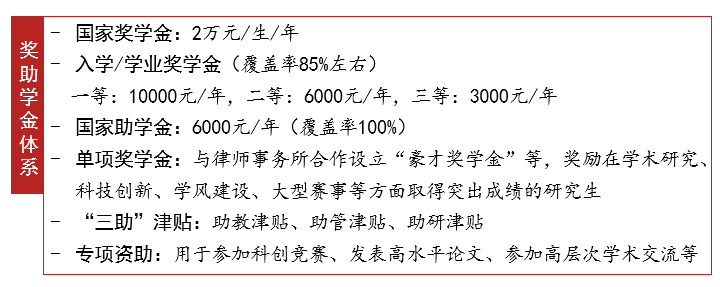 奖助学金制度健全,设立国家奖学金、入学/学业奖学金、国家助学金、单项奖学金、“三助”津贴等。学院专门出台《研究生教育质量提升计划与实施办法》,对研究生参与科创竞赛、发表高水平论文、参加高层次学术交流等给予大力资助与支持。