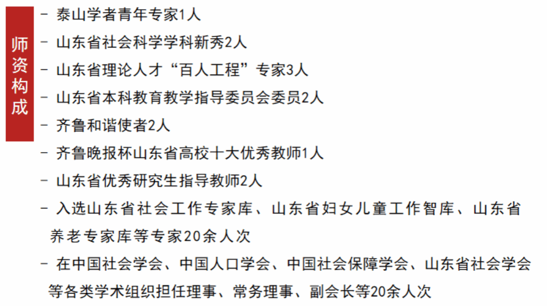 学院拥有教职工104人,其中专任教师92人,教授17人、副教授32人、具有博士学位教师60人,研究生导师57人。拥有享受国务院特殊津贴专家、山东省有突出贡献的中青年专家、泰山学者青年专家、山东省理论人才“百人工程”专家、山东省社会科学学科新秀、齐鲁和谐使者、齐鲁晚报杯山东省高校十大优秀教师等省部级专家20余人次,在中国社会学会、中国社会保障学会、中国法学会法学教育研究会、中国法学会宪法学研究会、中国法学会外国法制史研究会、山东省社会学会、山东省法学会等各类学术组织担任理事、常务理事、副会长等30余人次。