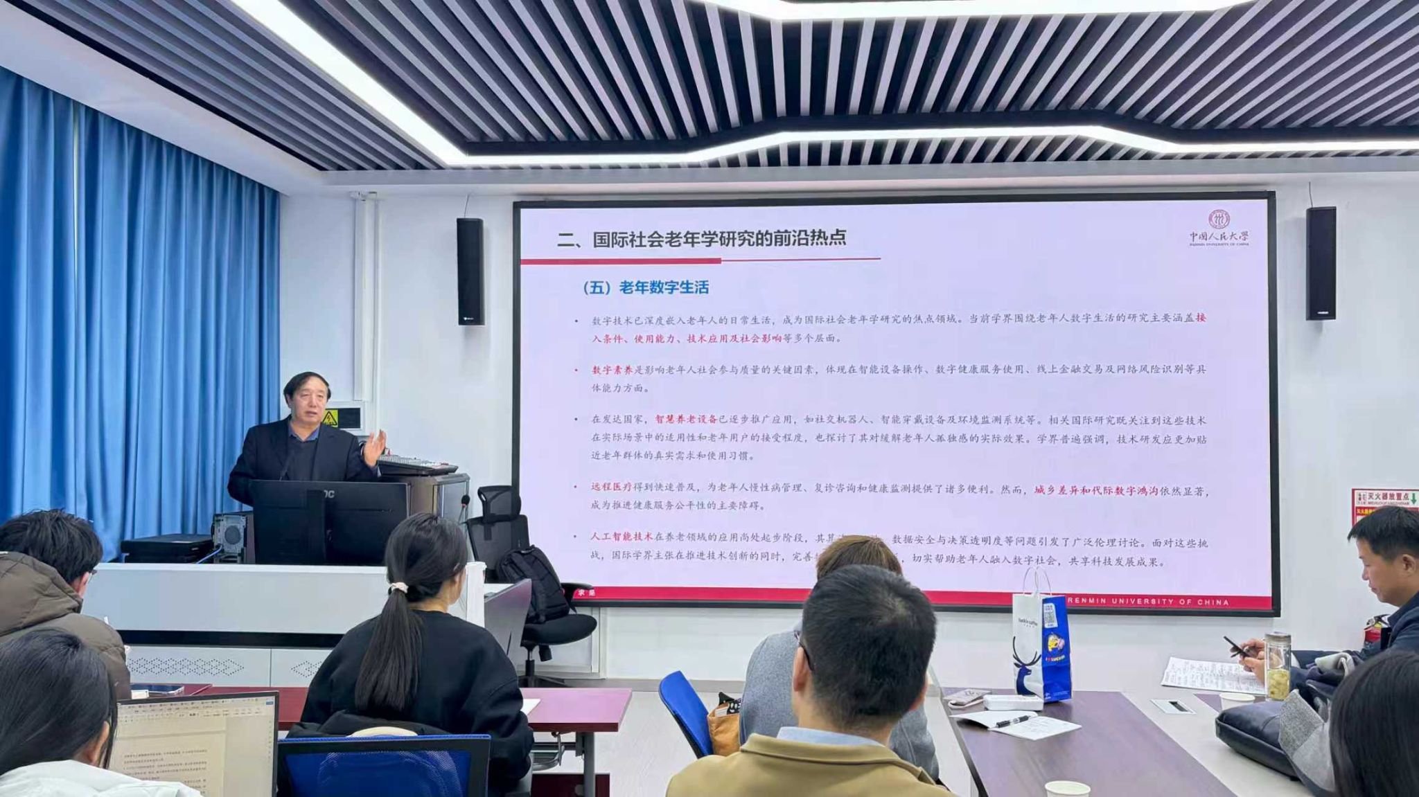 青龙山学术论坛在第四教学楼413教室顺利举行。本次论坛特邀中国人民大学人口与健康学院院长、老年学研究所所长杜鹏教授作《国际老龄研究进展与中国老龄自主知识体系构建》的学术报告。论坛由麻豆成人