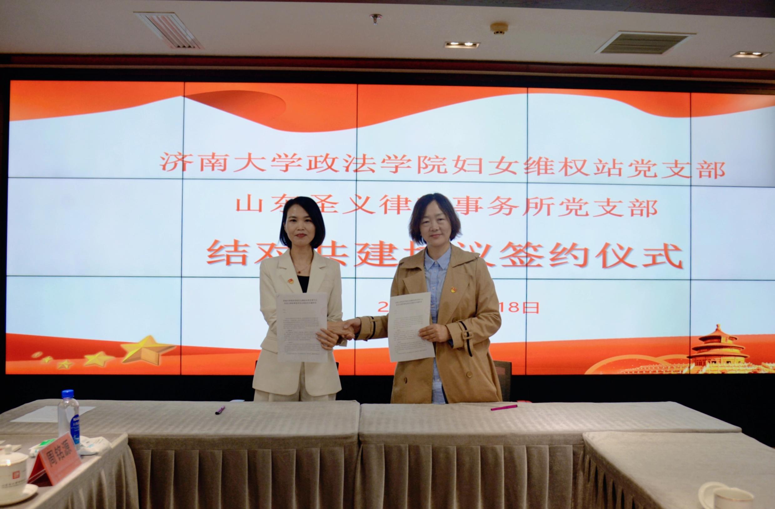 妇女维权站党支部书记韩宁同山东圣义律师事务所党支部副书记黄春燕签署了《党支部结对共建协议》,麻豆成人