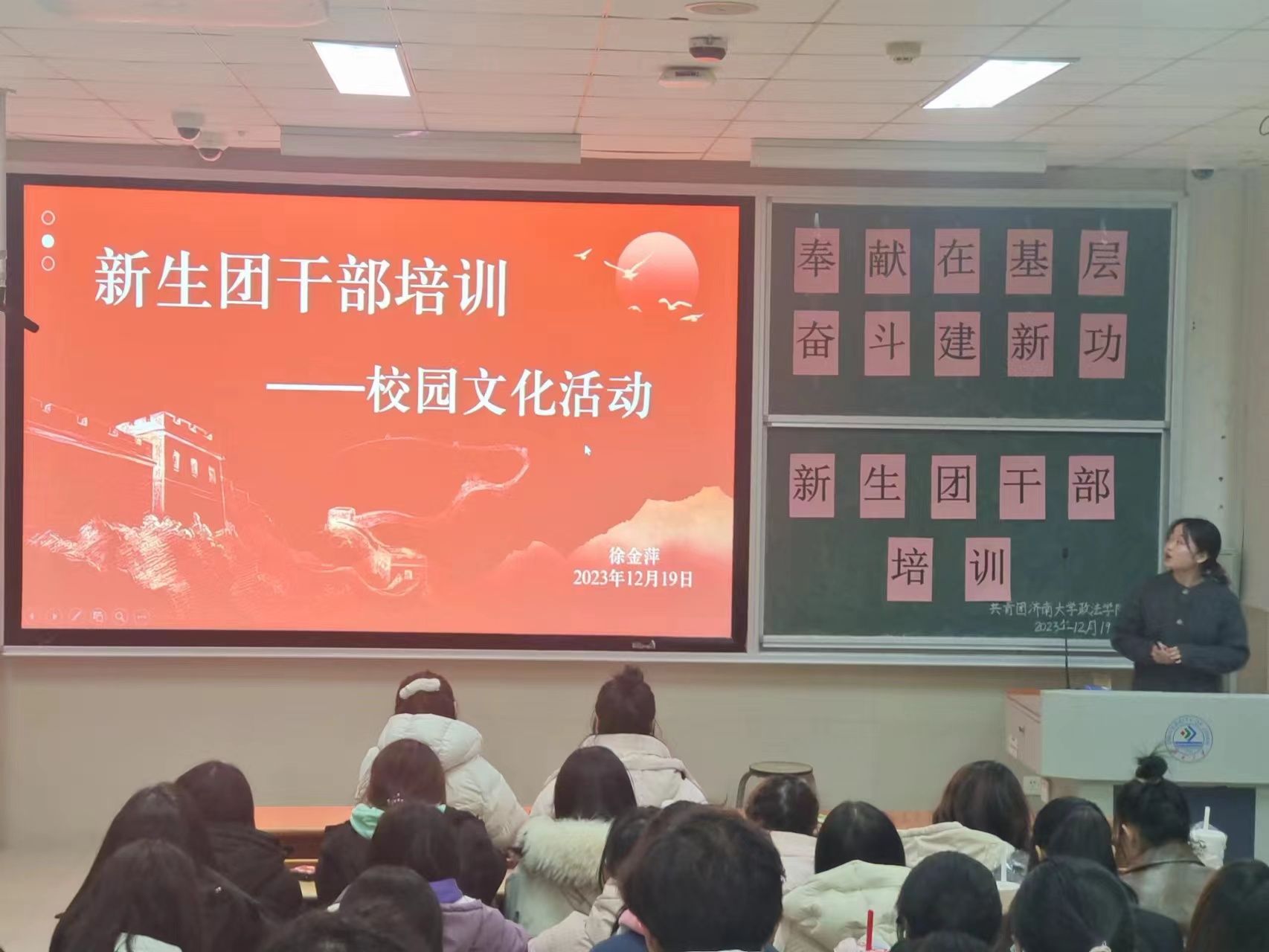 在校园文化工作培训中,学院第二十三届学生会主席团成员徐金萍为新生团干部介绍了丰富多彩的校园文化活动,勉励新生团干部为校园文化建设贡献青春力量,展现勇当先锋、踔厉奋发、笃行不怠的青春气质。