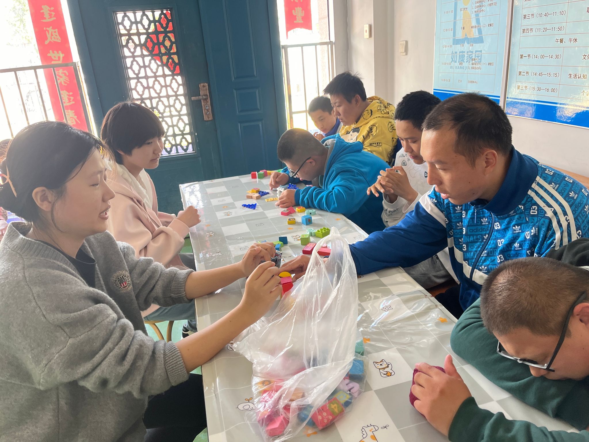 下午14:00,志愿者们准时抵达市中区信望爱基地,卸下背包后,温和耐心地与基地学员们对话。突如其来的暴雨也没有消灭志愿者们的热情,活动的场地由室外转为室内,志愿者们与学员进行搭积木、沙包投掷等活动,给自闭症儿童带去了更多欢乐。随后,志愿者们帮助学员们排练歌唱节目,为他们的进步和精彩表现作出赞扬。正如信望爱学员们歌曲中所唱的:“小小的梦想能改变世界,带来明天的盼望。”相信在志愿者们的共同努力下,自闭症儿童们的小小梦想也能被社会所关注。