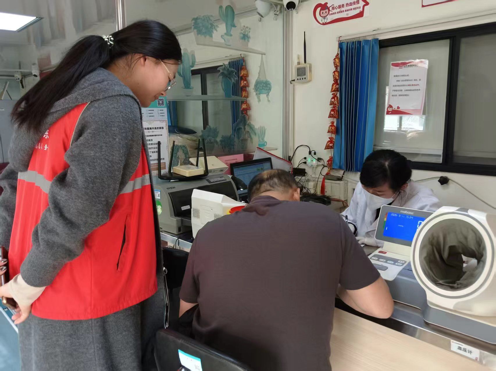 阳光先锋青年志愿者协会(以下简称“政法青协”)志愿者于3月11日前往山东省血液中心解放桥献血点开展以“热血传递暖人间”为主题的无偿献血志愿服务活动。 献血车内,志愿者们协助献血者完成扫码登记和个人信息录入,这不仅保护了献血者的隐私安全,还显示着现代化献血服务的专业与温度。检测合格后,志愿者们将一杯杯温热的糖水递至献血者手中。每一杯糖水,都是对献血者的贴心呵护,更是对奉献精神的无声致敬。志愿者们还将深蓝色纪念袋交至献血者手中,并细致讲解线上领奖流程。袋中承载的不仅是谢意,更是一份延续温暖的纽带,让爱心从指尖传递至心间。献血车外,志愿者们手持宣传册与二维码小卡,主动向驻足市民普及献血知识,他们耐心解答,以热情鼓励点燃善念。这场流动的科普课堂,让献血车的红色身影成为街头动人的文明风景。血液是生命的礼物,政法青协的志愿者们是传递这份礼物的桥梁,让每一滴热血都汇聚成守护生命的磅礴力量。今后,政法青协将持续开展此类志愿服务活动,不断践行自我奉献、自我进步的志愿精神,传递爱与关怀,为构筑和谐友爱的社会贡献青春力量。