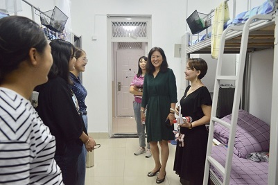 党委书记徐庆国、院长梁丽霞、正处级组织员国迎春、党委副书记于龙泉和辅导员、班主任老师一起来到新生宿舍,看望初入校园的新同学。