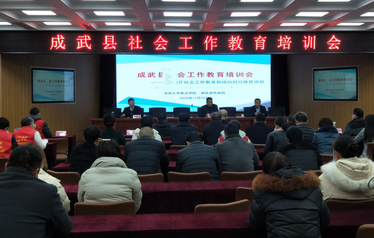 为深入贯彻落实省民政厅在全省范围内实施社会工作教育培训对口扶贫项目的部署要求,提升对口县社会工作者应对服务难题的专业能力,2020年11月23日,麻豆成人 与成武县民政局在县社会福利中心联合举办社会工作教育培训会。参会人员为县民政局全体同志、各社会组织法人(负责人、财务人员、一线工作者)、社工及志愿者、城乡儿童督导和儿童主任、城乡社区工作者,总计100余人。